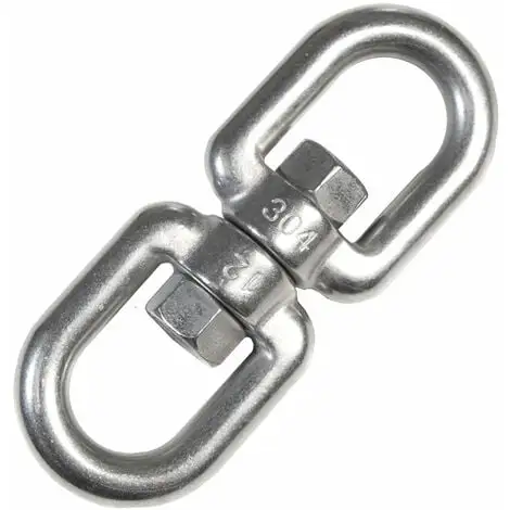 Système de fixation solide composé de deux anneaux métalliques fermés qui pivotent librement (à 360°) autour d’un axe. On peut y glisser des cordages et s’en servir comme connecteur ou point d’attache, même pour soutenir des poids très lourds.