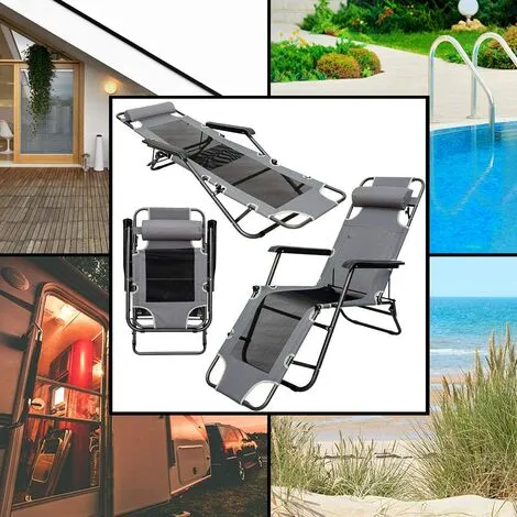 Asseyez-vous et profitez de l’été, la chaise longue pliable et inclinable est prêt pour vous en un clin d’il! Notre transat est facilement positionné où vous voulez et dans un instant à nouveau plié – sans aucun encombrement. Très confortable aussi bien assis qu’allongé grâce au appui-tête rembourré, la position réglables du dossier, les accoudoirs et le tissu en filet imperméable à la pluie et la saleté. Idéal pour le camping, se bronzer et se relaxer. Notre chaise longue est dotée de une large surface pour s’allonger, très confortable. Profitez bien de votre temps libre avec notre moderne chaise inclinable!
