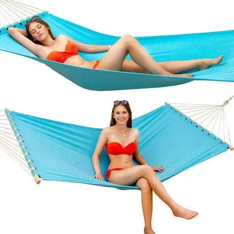 Bien sûr, le hamac en tissu peut supporter quelques gouttes de pluie – il redevient rapidement sec. En cas de forte averse, vous devez le placer à l’intérieur.