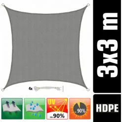 AMANKA Voile D’ombrage UV – 3×3 HDPE Carré Protection Solaire Toile Toiture Balcon Gris – Grau